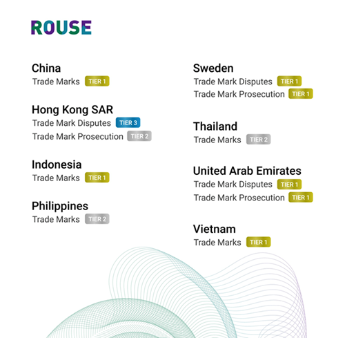 We are happy to share that eight jurisdictions are recognised at Rouse with seven Tier 1 recommendations for China, Sweden, UAE, Indonesia and Vietnam in the MIP Rankings for Trade Marks 2024.