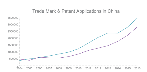 Trade Mark & Patent Applications in China from 2004 – 2016, source: SIPO website