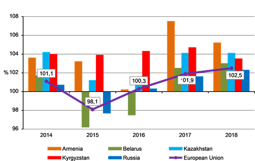 These two graphs illustrate that whilst the region suffered from 2014-2016 at least since 2017 economy of the EAEU has been growing. Not just Russia, but the whole region has seen improved economies. Perhaps, therefore, it is no surprise that the number of patent applications filed with the Eurasian patent office in 2018 was almost 6% higher than in 2017.
