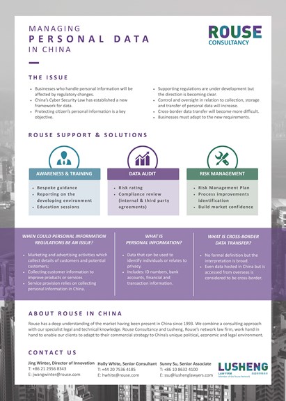 If you deal with personal information from China, the changes are likely to have an impact. In our latest briefing note (which you can download below), Holly White highlights the key personal data issues.  She outlines how Rouse can help your organisation to adapt via awareness and training, data and compliance audits and risk management strategies.