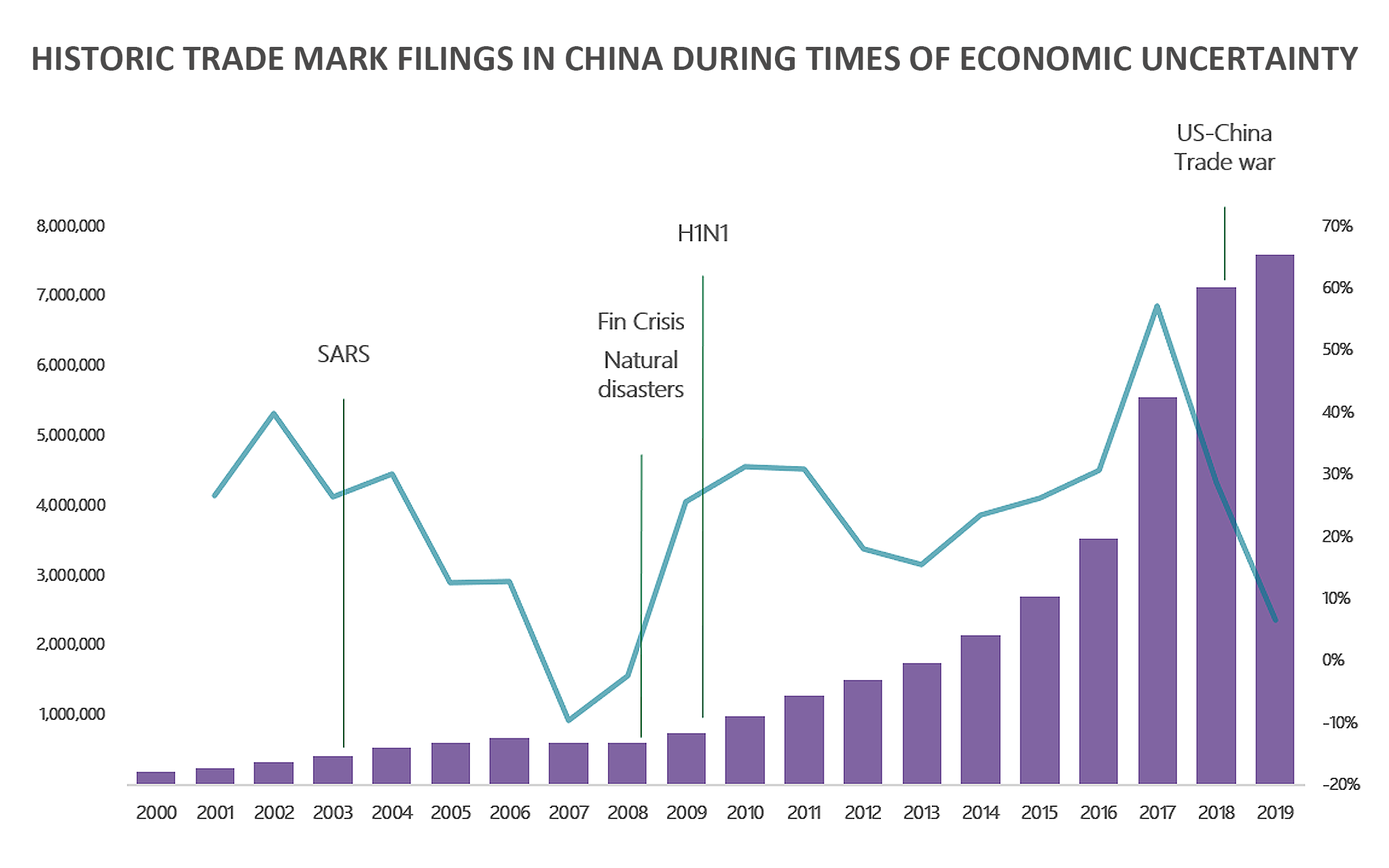 An analysis of trade mark filing activity in China across the past 20 years reveals the impact of past health and economic crises. SARS in 2004, the Global Financial Crisis of 2008/9, H1N1 and most recently the US-China trade war were all followed by reductions in filing activity.