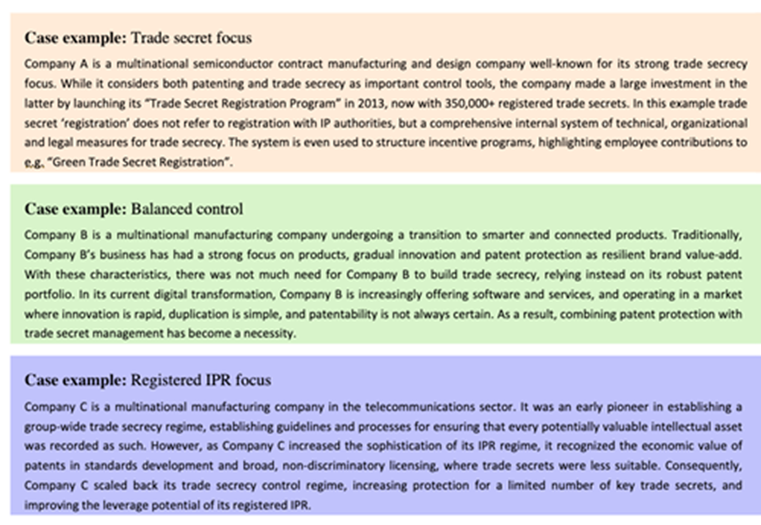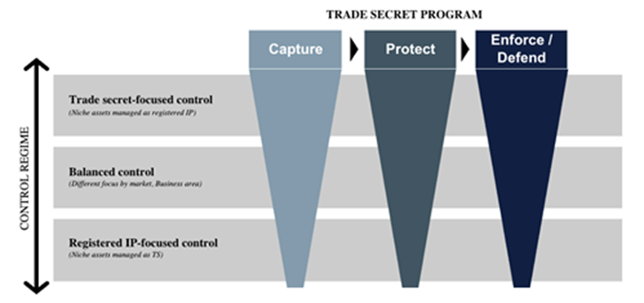 The importance of trade secrets will differ from company to company. A company’s trade secret strategy and program needs to be tailored to what we refer to as the control regime that fits their business requirements best. Determining a company’s control regime involves assessing the relative importance of a trade secret versus a registered IP control scheme as an effective means to control a company’s most valuable intellectual assets. To do so, a range of factors related to a company’s business operations and the industry/sector in which they operate need to be considered.