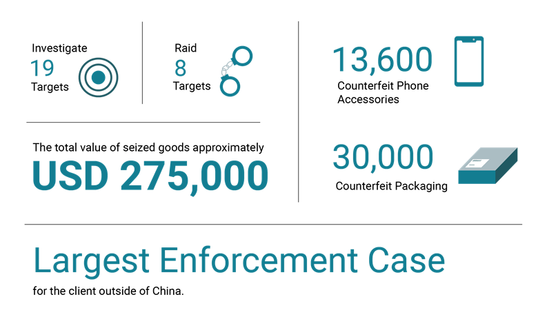 Rouse represented this client in its biggest-ever raid in the Philippines. Rouse completed an investigation against 19 targets, and raided 8 selected targets on the same day, seizing almost 13,600 counterfeit phone accessories and more than 30,000 counterfeit packaging in 5 locations. This sent a strong deterrent message to the local counterfeit network. The total value of seized goods was approximately USD 275,000 and was the largest enforcement case for the client outside of China.